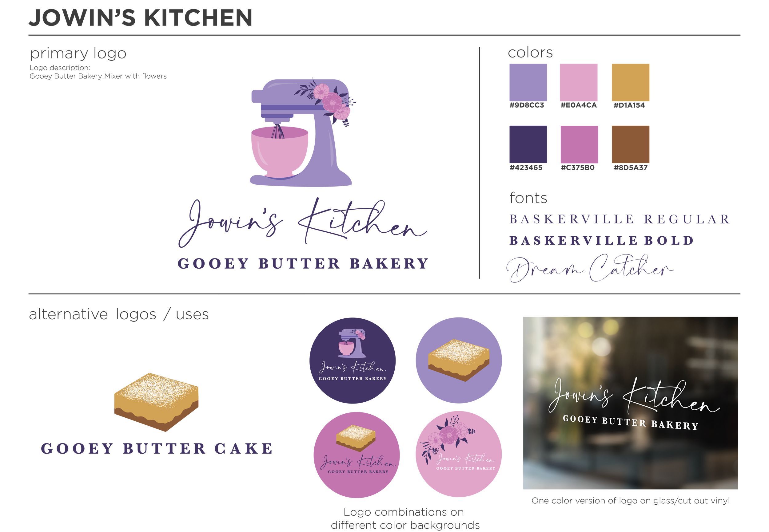 THIS IS A DELICIOUS BAKERY LOCATED IN COLUMBIA, MO SPECIALIZING IN GOOEY BUTTER CAKE. THE LOGO INSPIRATION WAS TAKEN FROM THE THE HANDWRITTEN SIGNATURE OF THE COMpANY’S NAMESAKE, JOWIN, ALONG WITH A HAND DRAWING OF A MIXER, BOTH IMPORTANT PARTS OF THE BAKERY’S FAMILY ATMOSPHERE AND HISTORY. BRIGHT COLORS AND FLORALS WERE ADDED TO FURTHER ACCENTUATE THE STORE’S BRAND. A SECONDARY LOGO WAS ADDED SPECIFICALLY FOR THE GOOEY BuTTER CAKES.