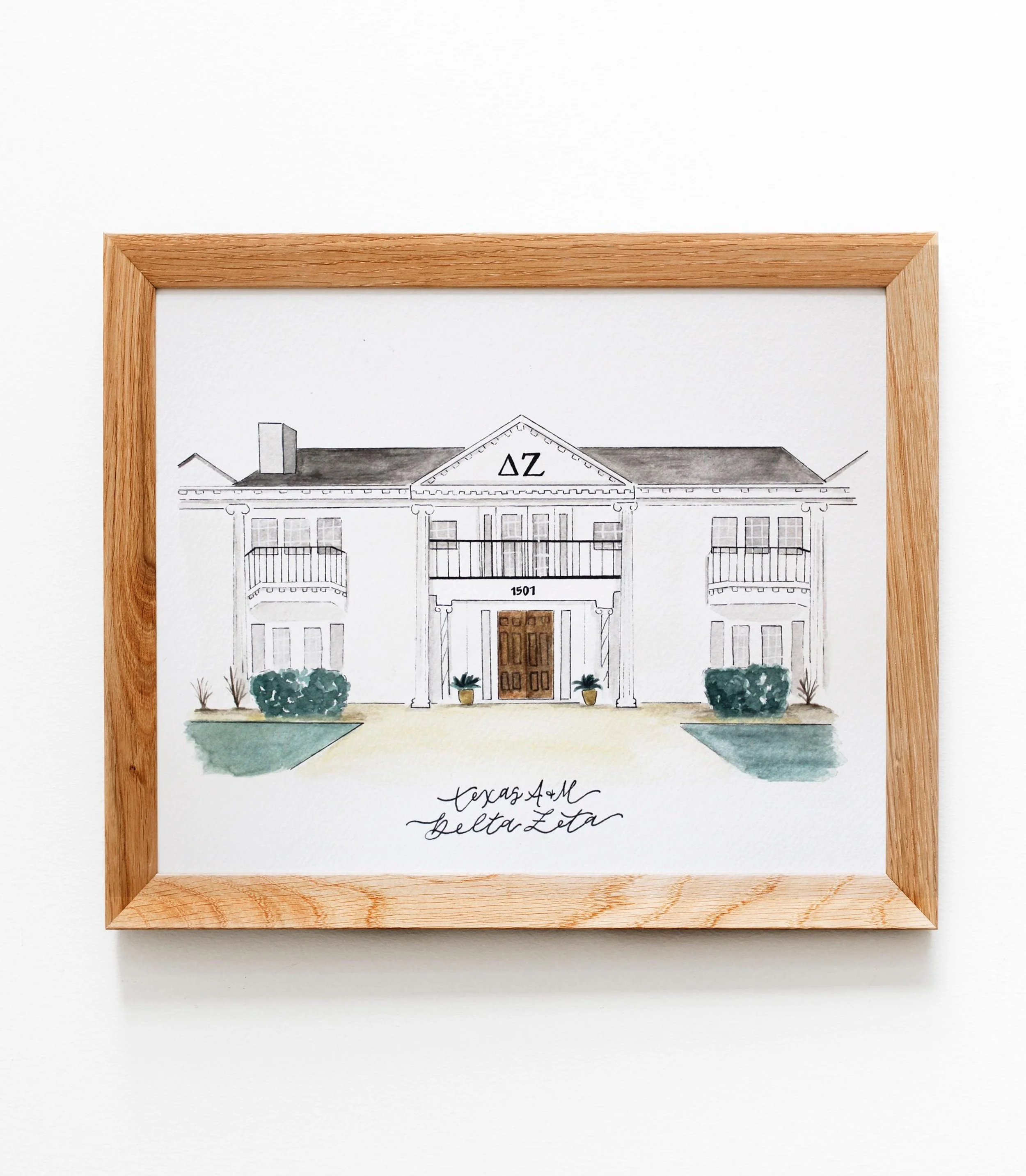Watercolor print of Delta Zeta Texas A&M sorority house -8x10inches printed on premium matte stock (Other sizes available upon request)