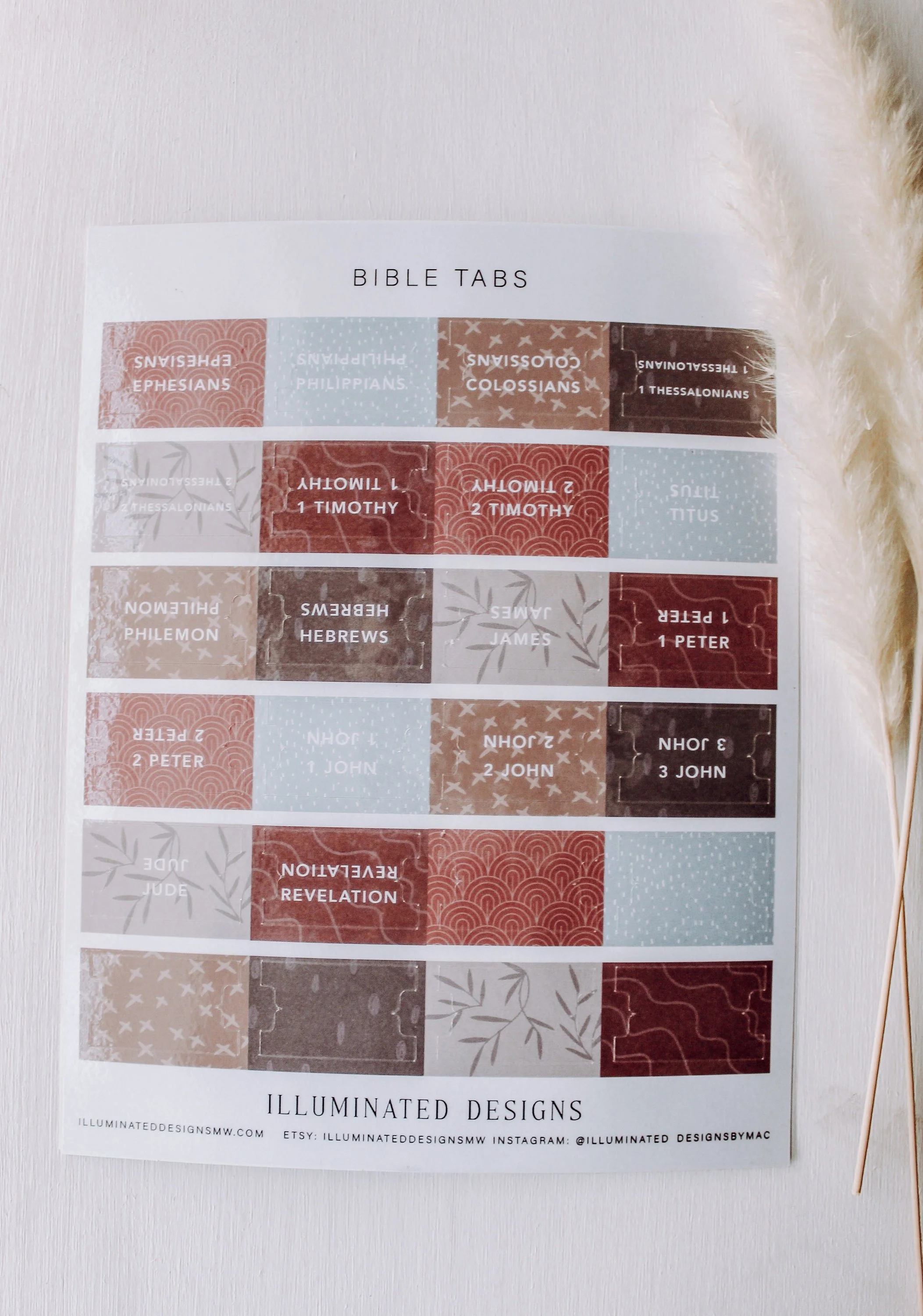 Shop › Laminated Bible Tabs with Adhesive Backing Laminated Bible Tabs with Adhesive Backing $22.00 3 total sheets of Bible TabsEach tab is 1.5" x 1" (before folded)Material is laminated cardstock with an adhesive backing 66 tabs + extra tabs or choice of Deuterocanonical books (Catholic books) Additional personalization is available upon request! 3 total sheets of Bible TabsEach tab is 1.5" x 1" (before folded)Material is laminated cardstock with an adhesive backing 66 tabs + extra tabs or choice of Deuterocanonical books (Catholic books) Additional personalization is available upon request! Tabs: Select Tabs 66 73 (Catholic) Style: Select Style Red Orange Purchase Added!