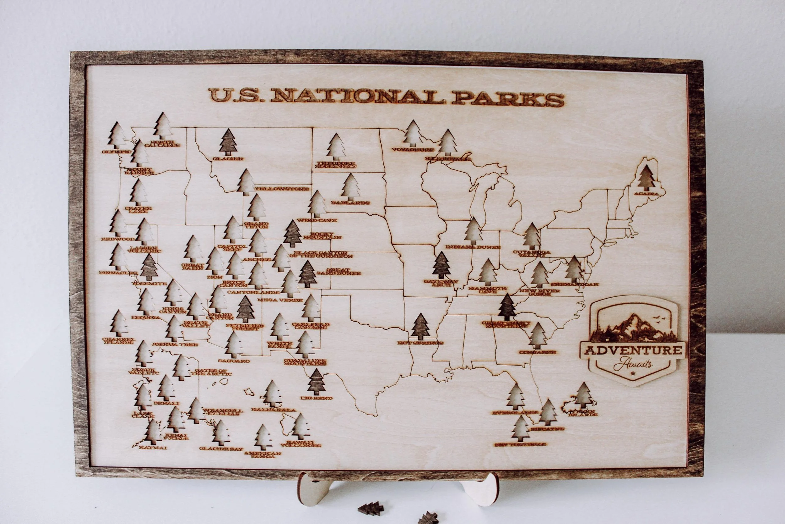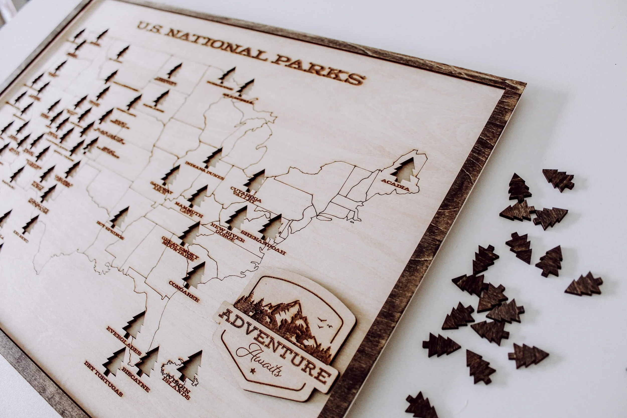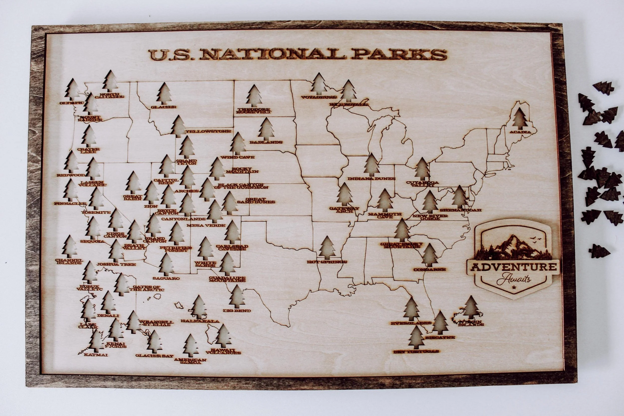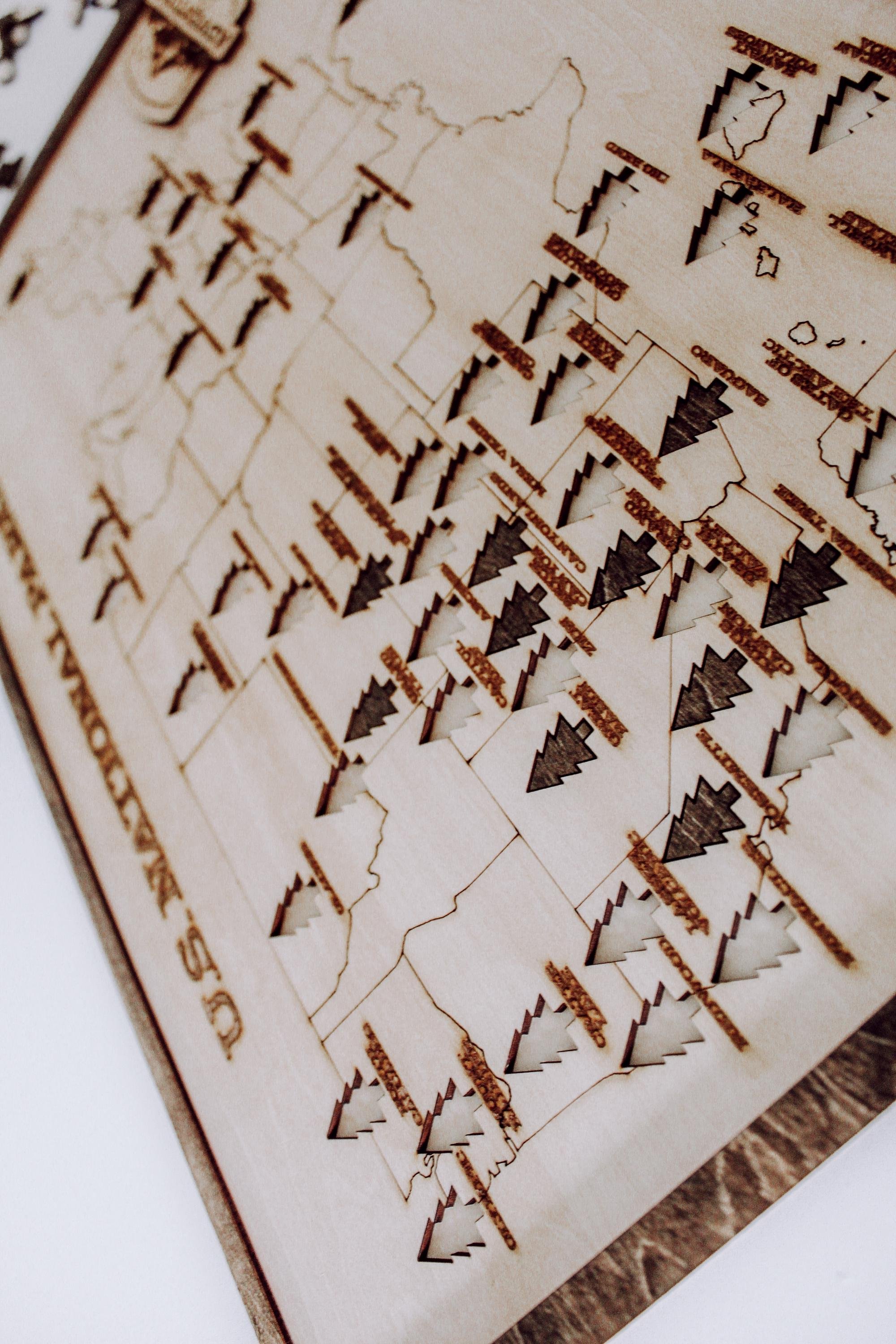 Shop › National Parks Wood Map National Parks Wood Map $65.00 18"x12"x.75" engraved wood puzzle 3mm Basswood, backing and border stainedRemovable tree pieces for each location (63)Wood Stand included 18"x12"x.75" engraved wood puzzle 3mm Basswood, backing and border stainedRemovable tree pieces for each location (63)Wood Stand included Purchase Added!
