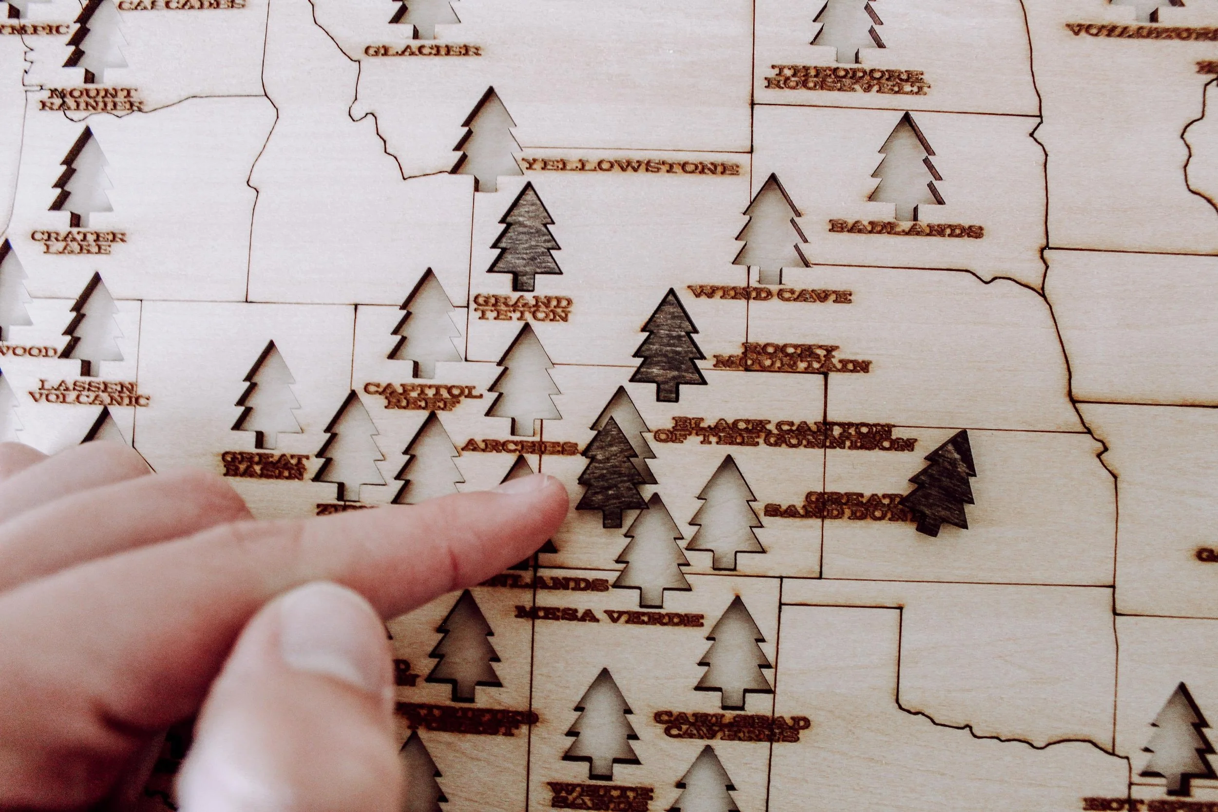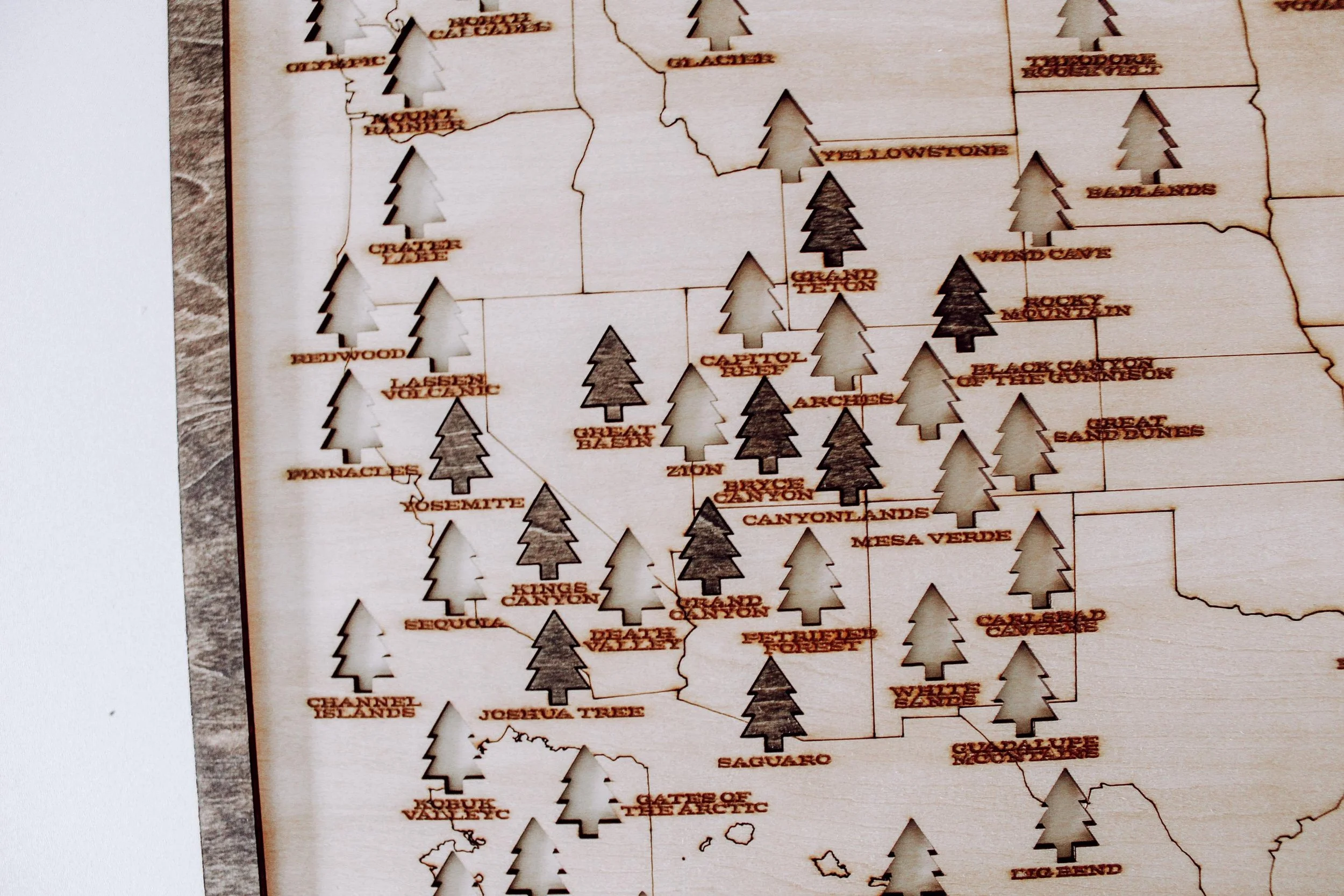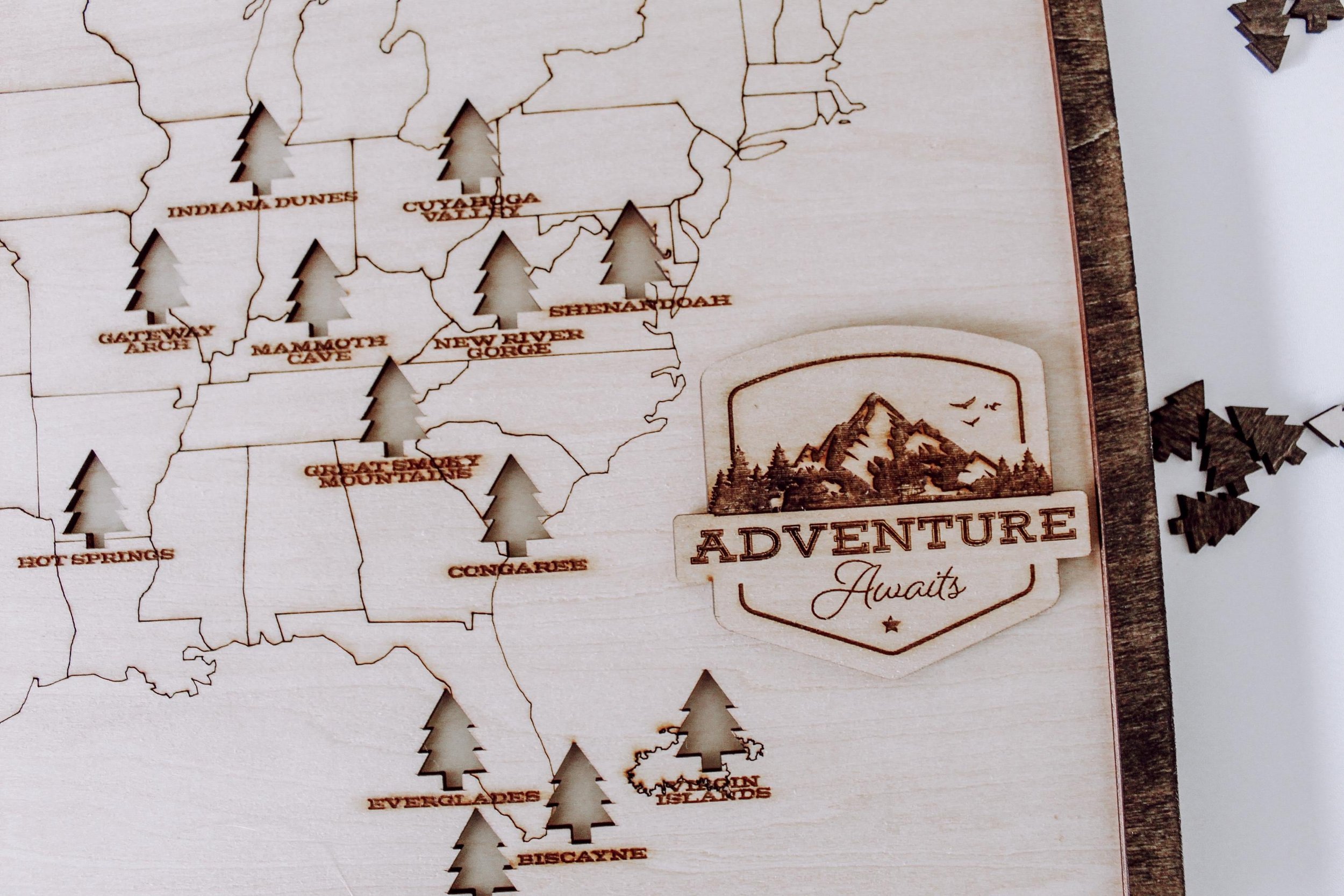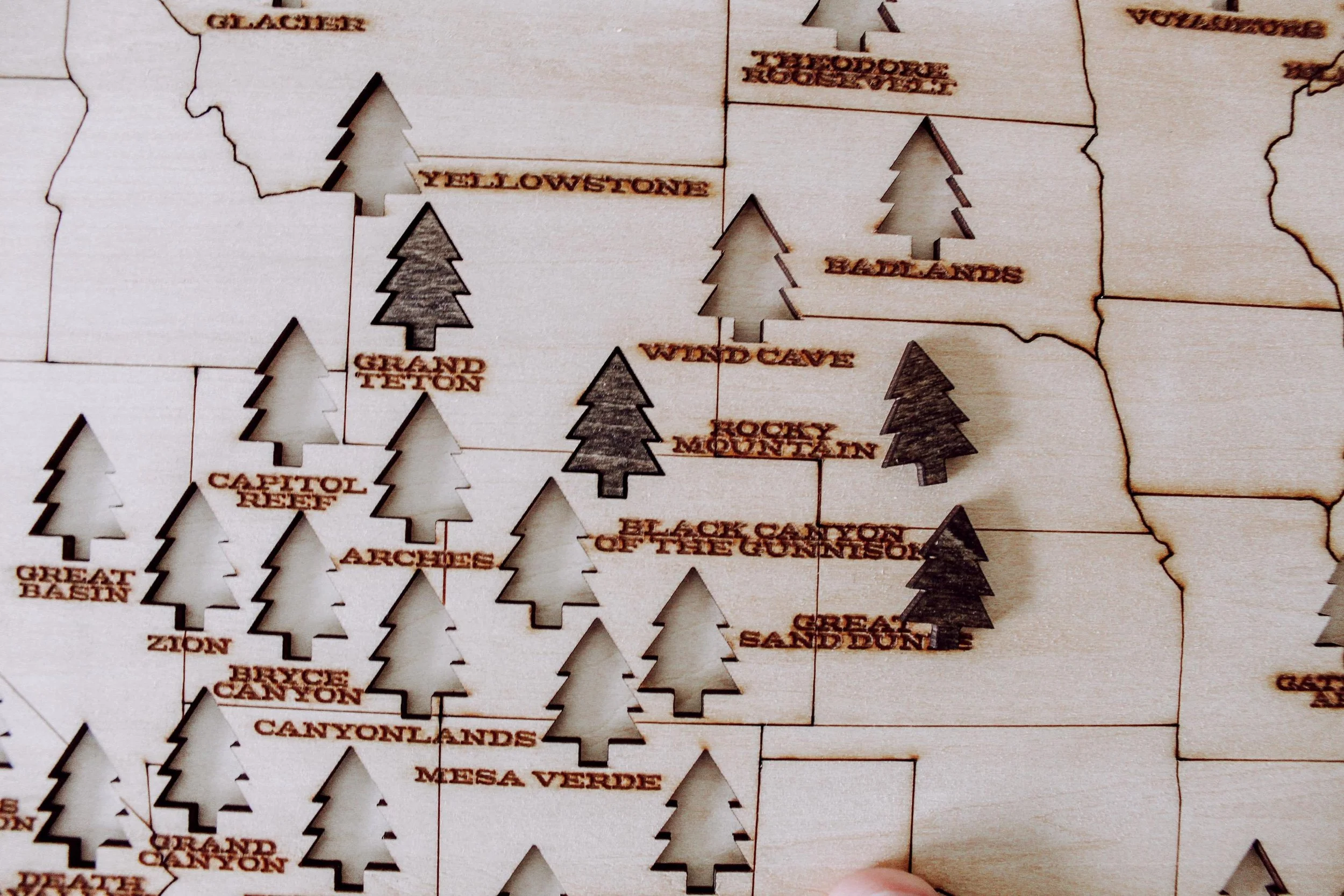 Shop › National Parks Wood Map National Parks Wood Map $65.00 18"x12"x.75" engraved wood puzzle 3mm Basswood, backing and border stainedRemovable tree pieces for each location (63)Wood Stand included 18"x12"x.75" engraved wood puzzle 3mm Basswood, backing and border stainedRemovable tree pieces for each location (63)Wood Stand included Purchase Added!
