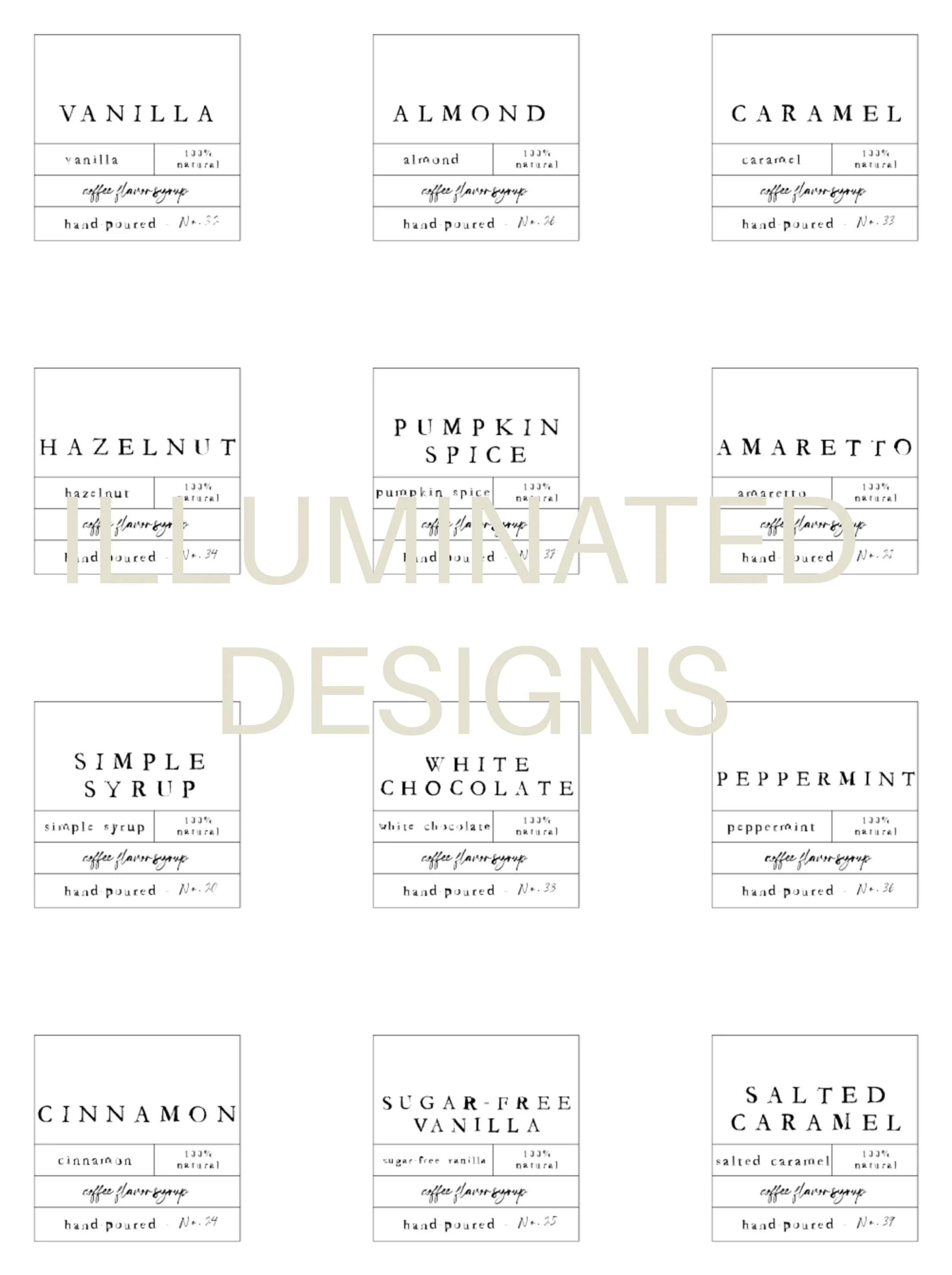 Digital Printable Coffee Syrup Labels This download contains 2 files. One is a zip file containing 16 separate square .svg labels. The second is a pdf file with all labels on two 8.5X11inch sheets (a preview is shown in the listing photos). These labels are each 2x2inches on the pdf. Users can print the ready made .pdf or resize using the svg files.