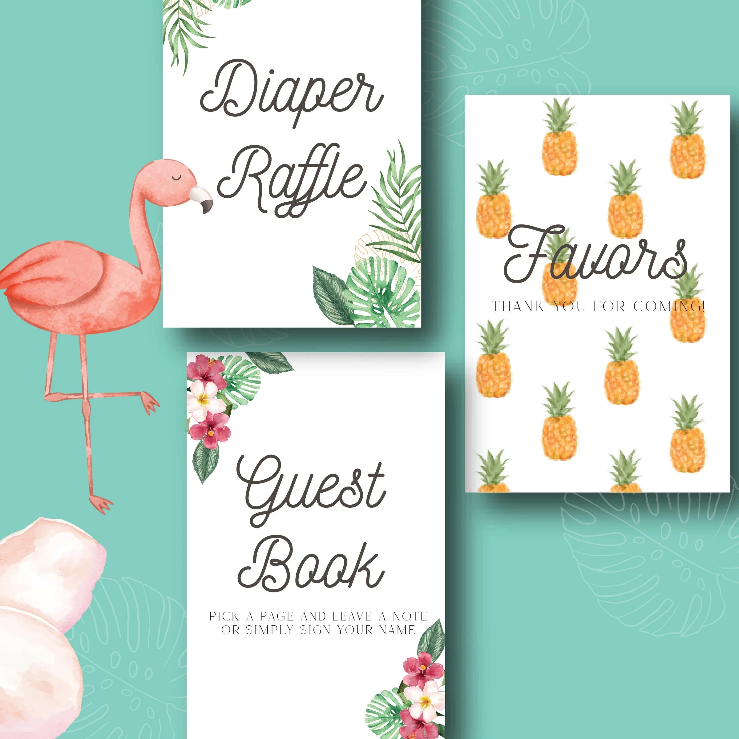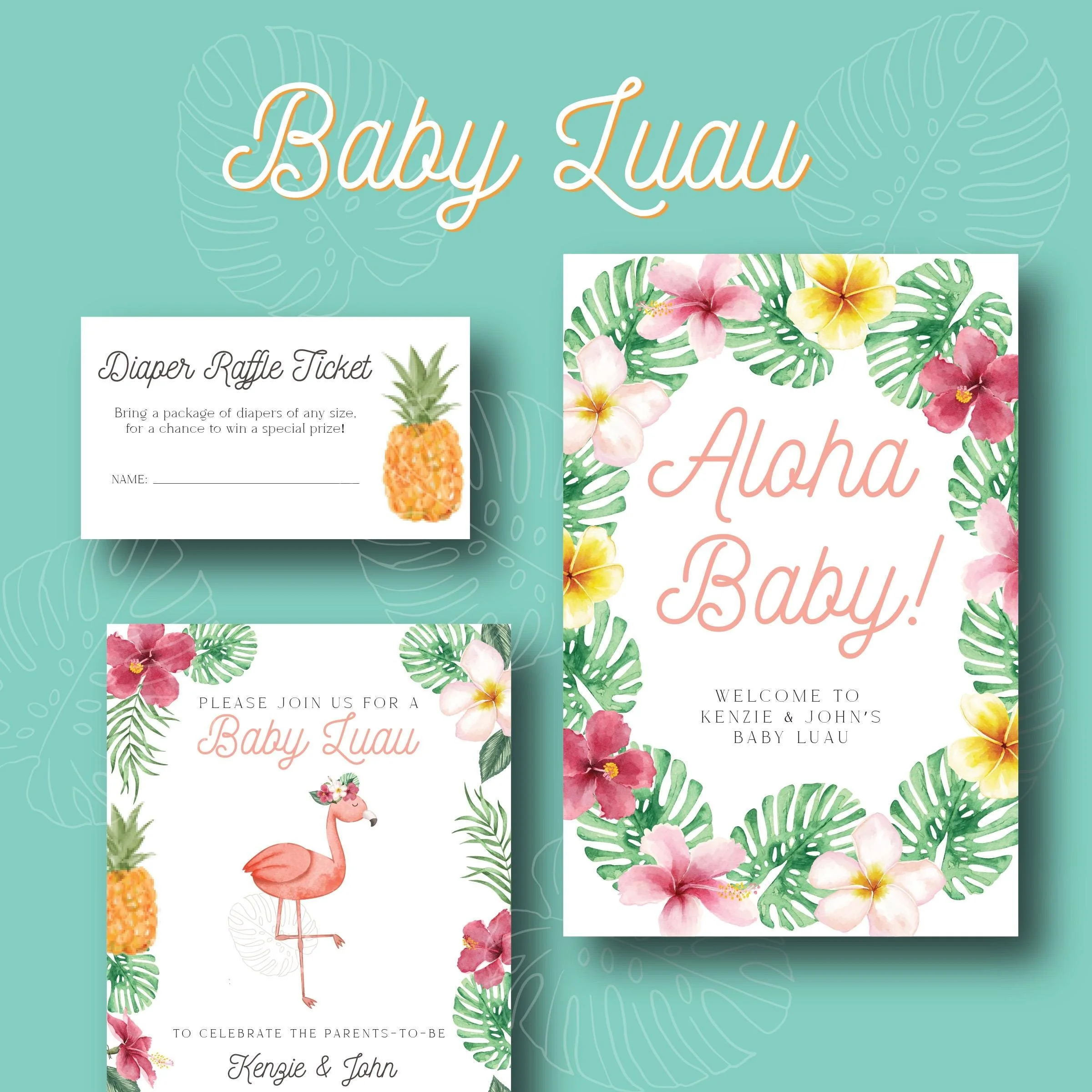 Baby Luau party set Includes: 24"x36" Aloha Baby poster 5"x7" Invitation 4"x6" set of Table Signs 3.5"x2" Raffle Tickets