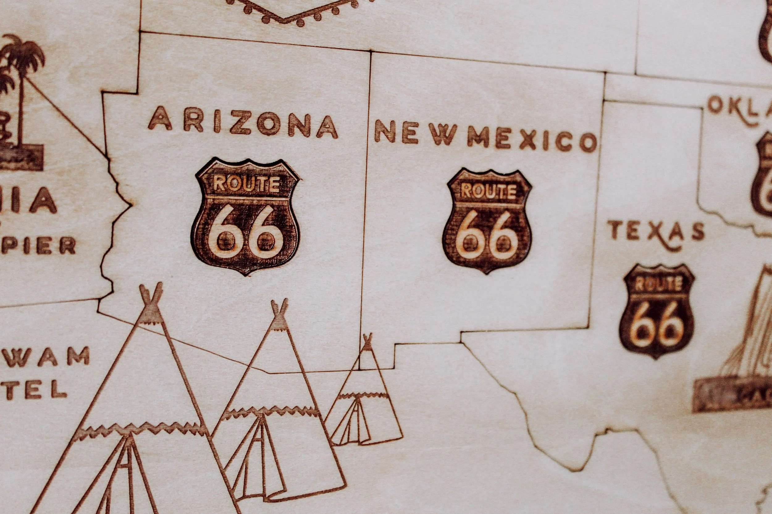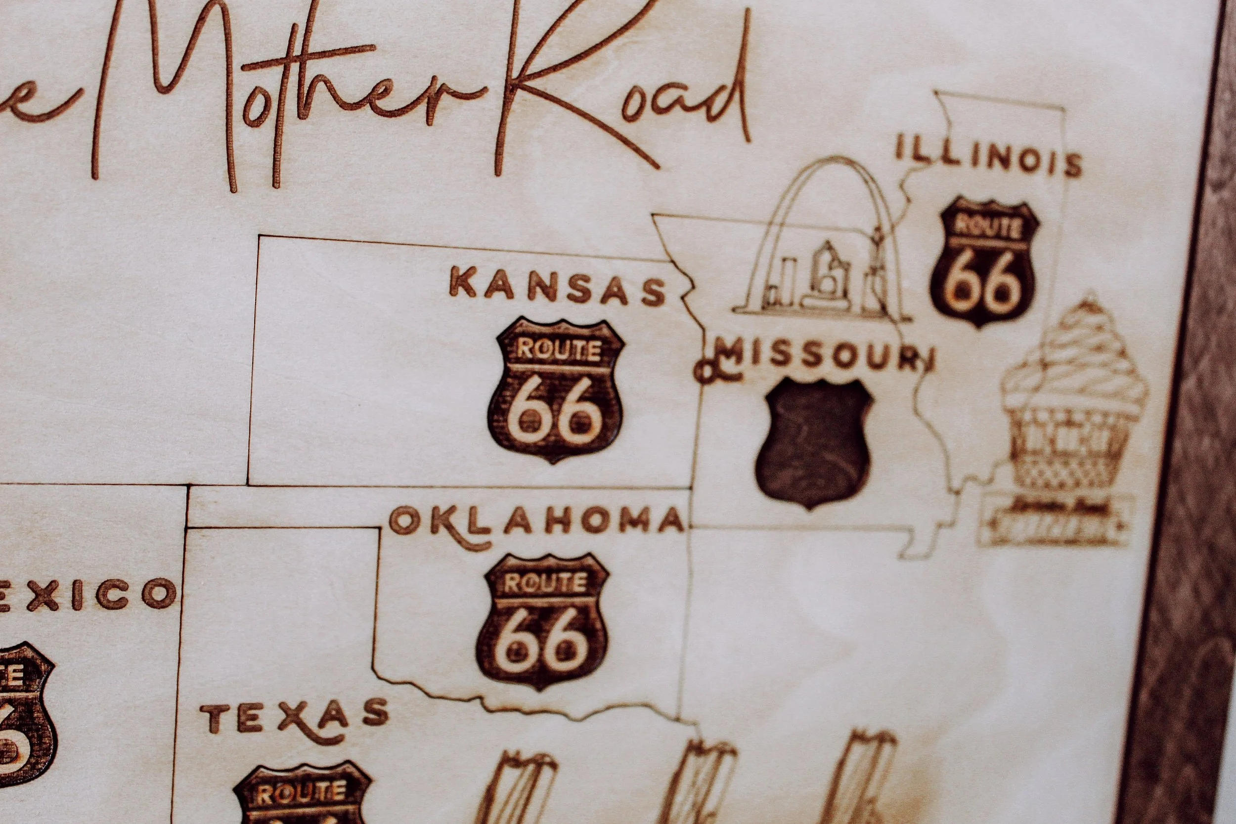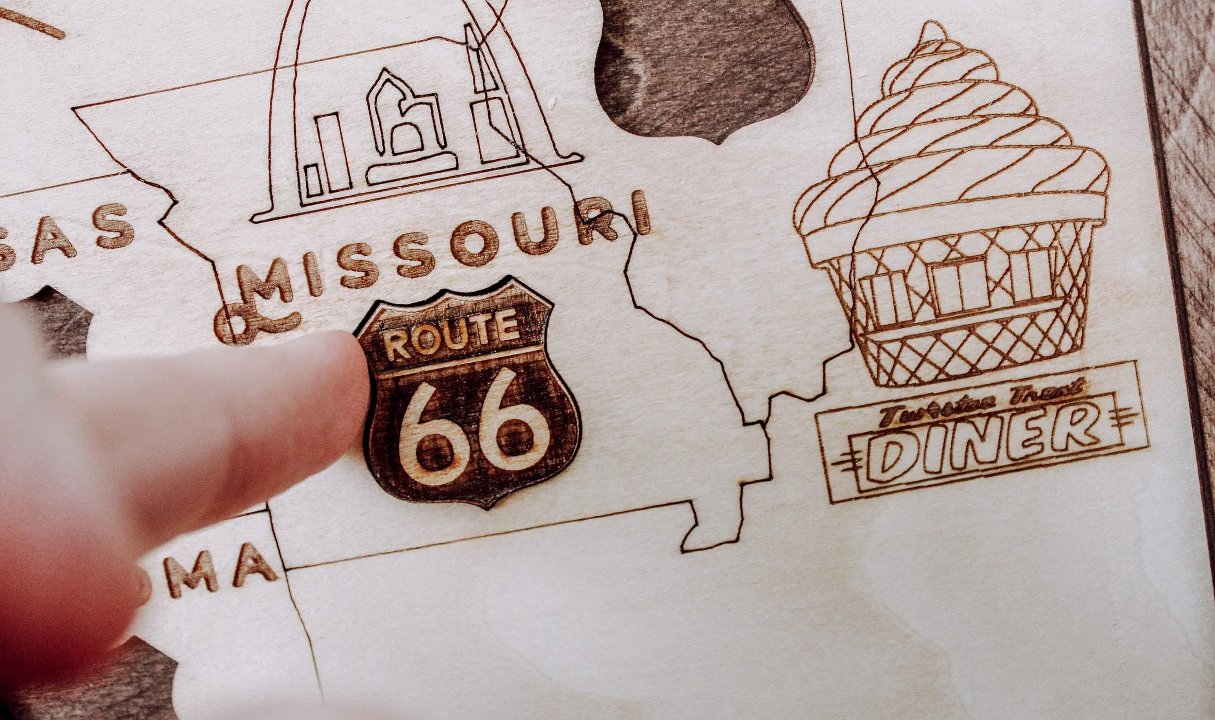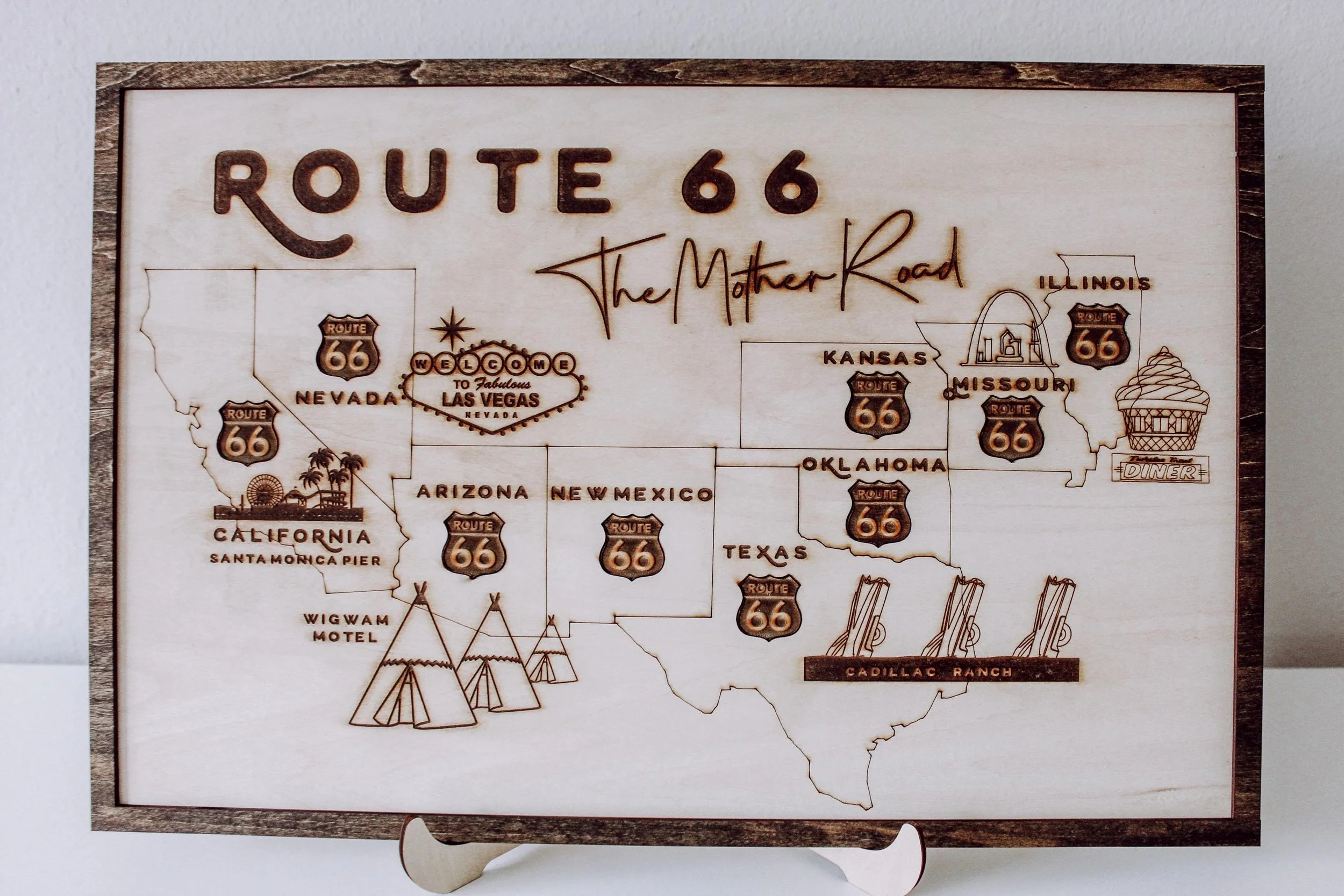 Shop › Route 66 Wood Map Route 66 Wood Map $65.00 18"x12"x.75" engraved wood puzzle 3mm Basswood, backing and border stainedRemovable route 66 pieces for each stateWood Stand included 18"x12"x.75" engraved wood puzzle 3mm Basswood, backing and border stainedRemovable route 66 pieces for each stateWood Stand included Purchase Added!